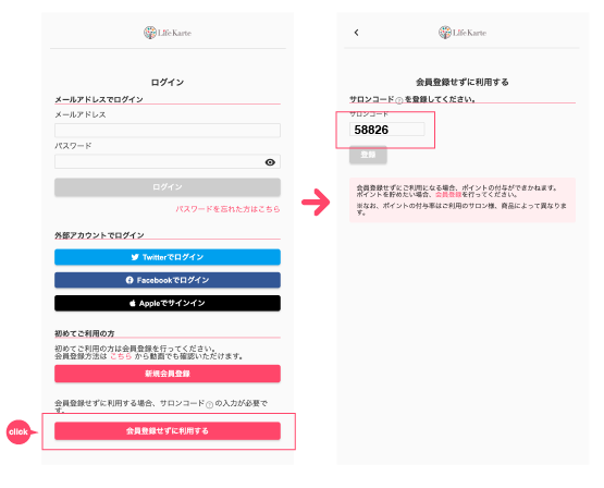 下のボタンよりお入りください。サロンコード「58826」を入力いただきますとご利用いただけます。